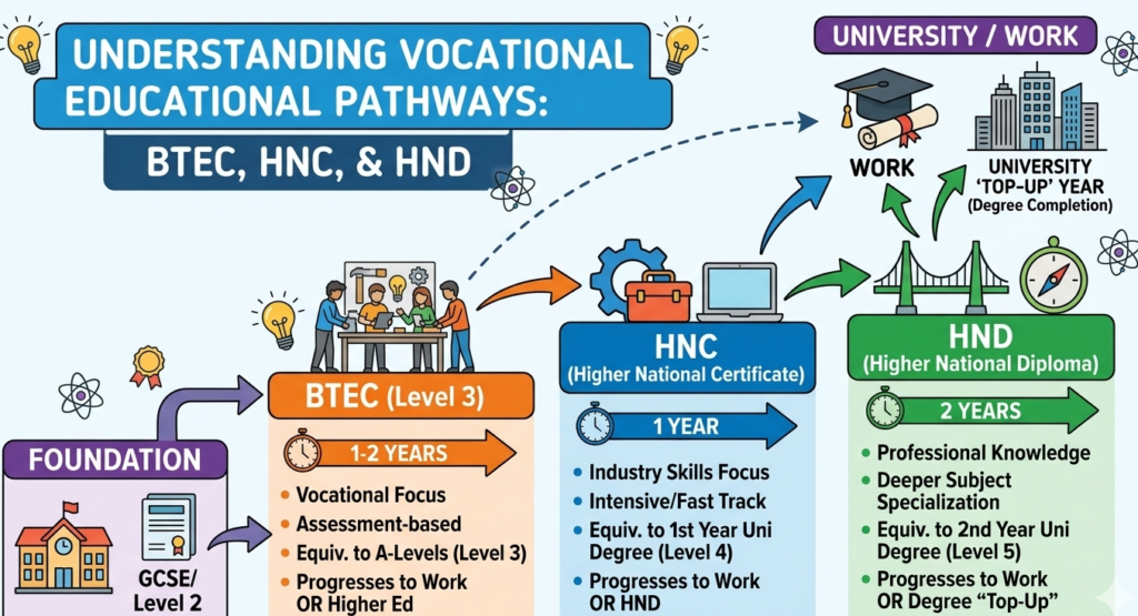 Choosing the right qualification can be confusing for students who want practical, career-focused education. Three popular vocational qualifications often compared are **BTEC**, **HNC**, and **HND**. While all three focus on developing practical skills and industry knowledge, they differ in level, duration, and academic progression. Understanding these differences can help students choose the pathway that best suits their career goals.